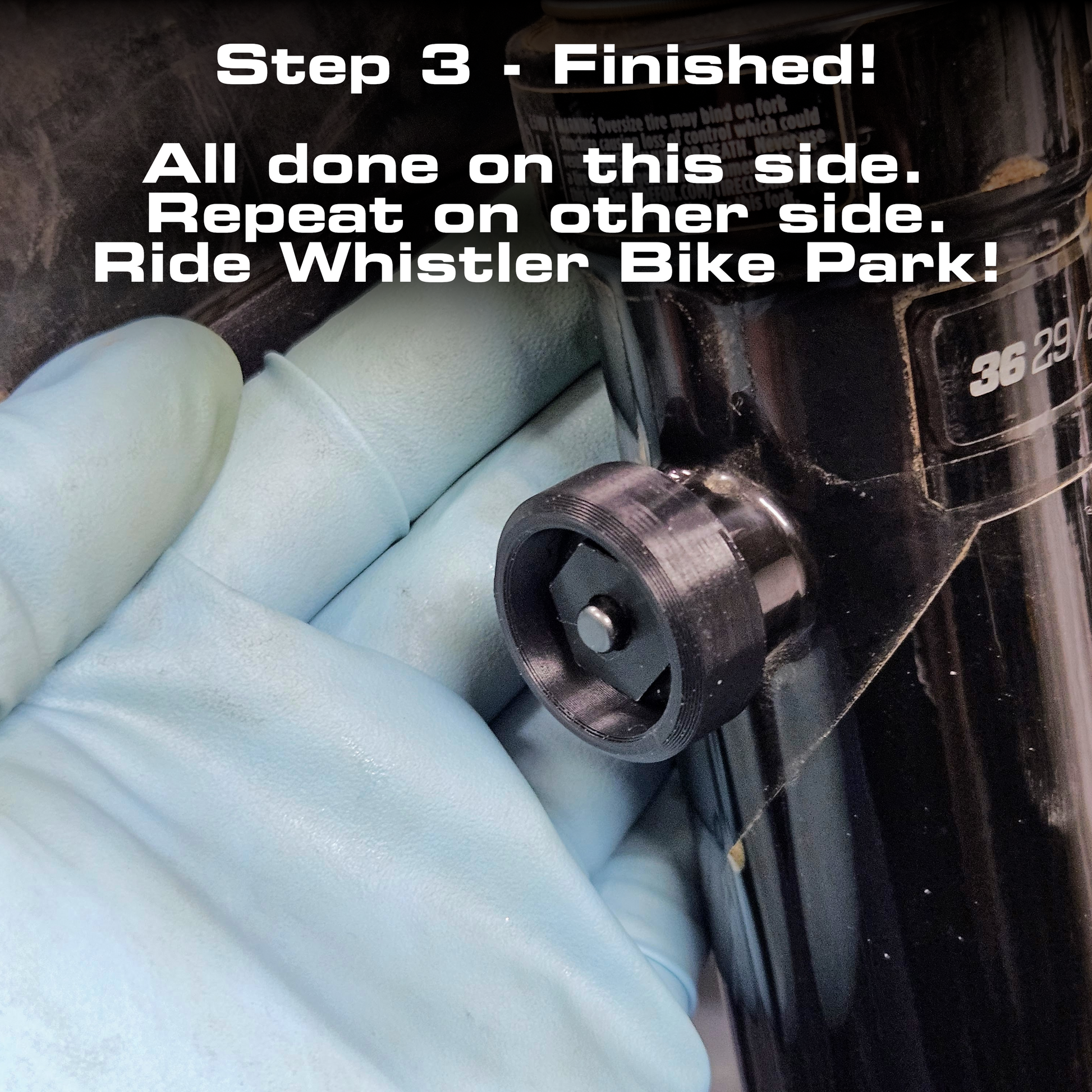 Protect your fork from the Fitzsimmons chair! The ELKL ValveProtect for Fox forks is a bolt-on shroud around the bleeder valves of 2020+ Fox forks, protecting the valves from damage from the carriers of the Whistler Bike Park Fitzsimmons chair.